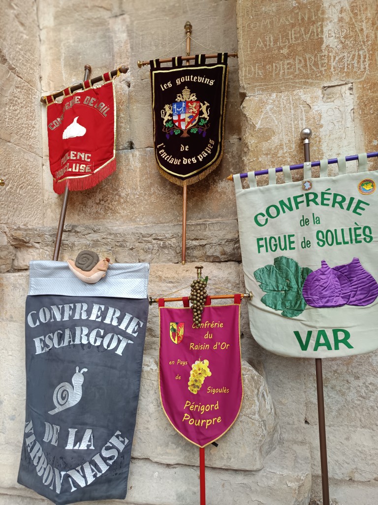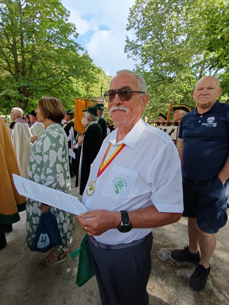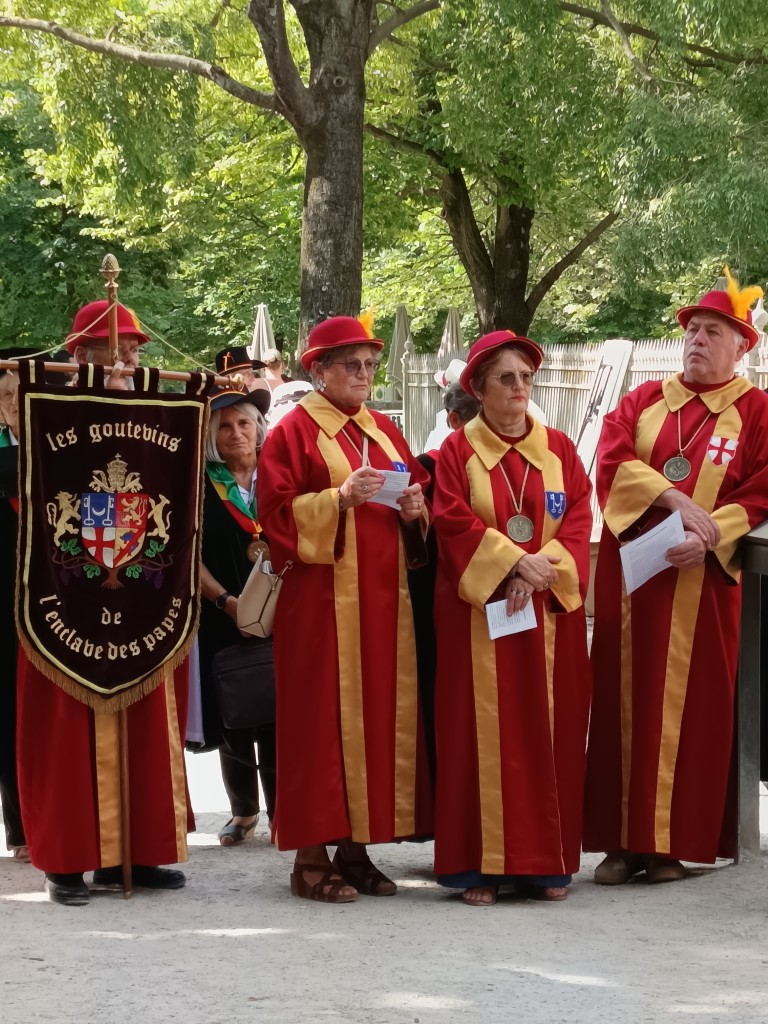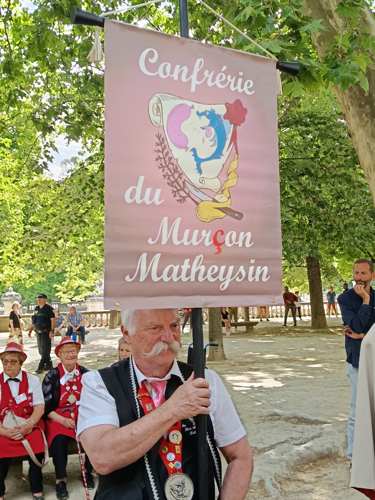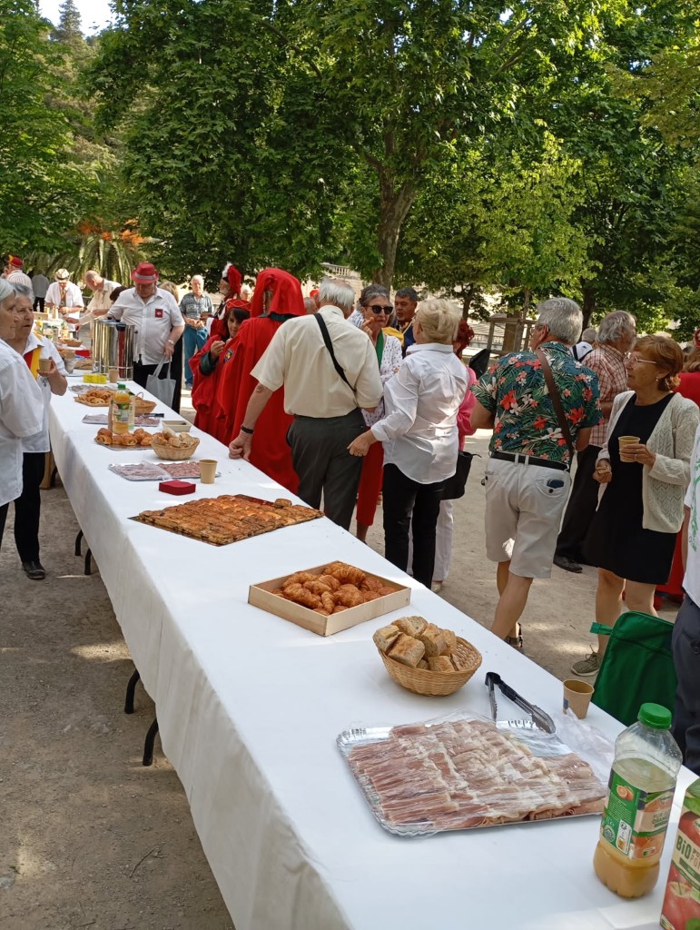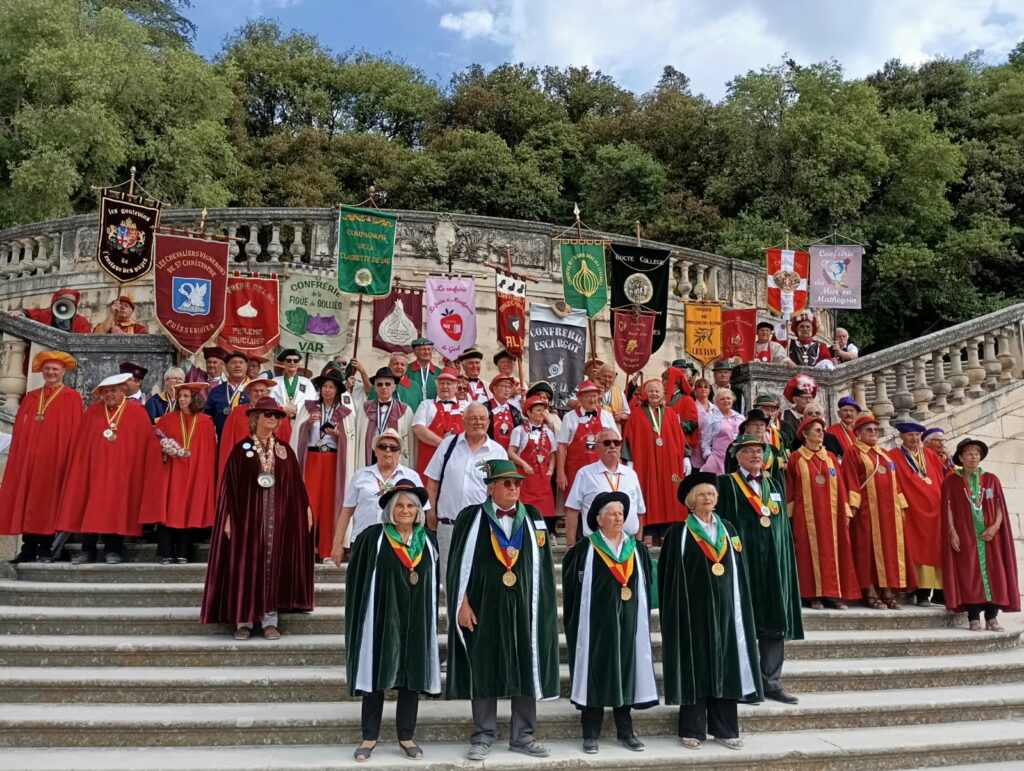 Les 24 Confréries, venues de l’Occitanie, de la Drome, de Savoie , de l’Isère, de la Dordogne, du Finistère, se constituent en défilé, pour la promenade dans le jardin de la Fontaine.